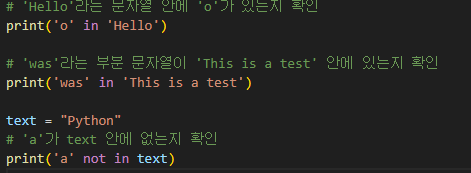 in 연산자는 문자열 안에서 특정 문자나 부분 문자열이 존재하는지 확인할 때 사용됩니다. 이 연산자는 True 또는 False를 반환하는 논리 연산자입니다. 그 반대인 not in연산자도 존재하는데 not in을 사용하면 특정 문자열이 포함되어 있지 않은지 확인할 수 있습니다.