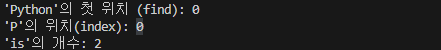 변수이름.index(찾을_문자열): find()와 유사하게 처음 나타나는 인덱스를 반환하지만, 찾지 못하면 ValueError 오류를 발생시킵니다.