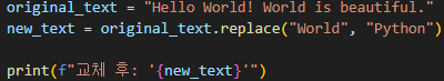 변수이름.replace(바꿀_대상_문자열, 새로운_문자열): 특정 부분 문자열을 다른 문자열로 모두 교체한 새로운 문자열을 반환합니다. 원본 문자열은 변경되지 않습니다.
