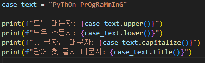 변수이름 .title(): 각 단어의 첫 글자만 대문자로 변환합니다.