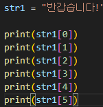 예제로 반갑습니다! 라는 문장이 있습니다.해당 문장을 각 인덱스 별로 추출 해보겠습니다.