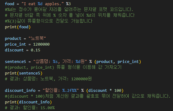 문자열 안에 %s, %d, %f 같은 타입별 자리표시자를 넣고, 문자열 뒤에 %를 쓰고 튜플 형태로 값을 넣어 줍니다.