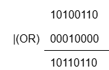 원본 데이터 10100110에서 4번 비트(오른쪽 0부터 세면 4번 비트, 10100110)를 무조건 1로 만들고 싶을 때(0으로 만들고 싶어도 상관없습니다) OR연산자를 사용하고 켜고 싶은 비트 위치만 1로 만들고 나머지는 0인 마스크(00010000)를 만듭니다.