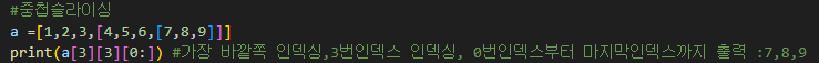 리스트 슬라이싱을 하기전 중첩인덱싱을 통해 먼저 원하는 리스트까지 접근을 해야하며,