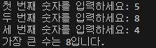 사용자로부터 정수 3개를 입력받아, 그 중 가장 큰 수를 출력하는 프로그램을 작성하세요.