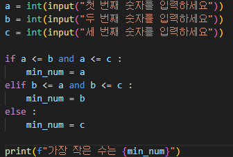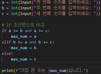 if a >= b and a >= c: # if 조건 a보다 b의 값이 작거나 같을 때 그리고 a보다 c의 값이 작거나 같을 때