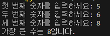 print(f"가장 큰 수는 {max_num}입니다.") # 출력 : 가장 큰수는 8입니다.