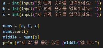 print(f"세 값 중 중간 값은 {middle}입니다.") # 출력 : 세 값 중 중간 값은 4 입니다.