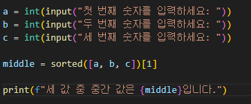 print(f"세 값 중 중간 값은{middle_num}입니다.") #출력 : 세 값 중 중간 값은 8 입니다.