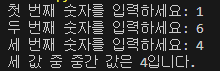 - 사용자로부터 정수 3개를 입력받아, 가장 크지도 작지도 않은 ‘중간값(두 번째로 큰 수)’을 출력하는 프로그램을 작성하세요.
