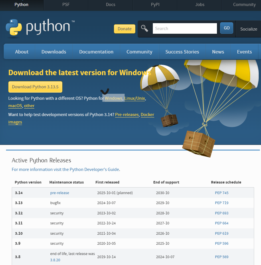 (공식 홈페이지 : https://www.python.org , 다운로드 페이지 : https://www.python.org/downloads/ ,