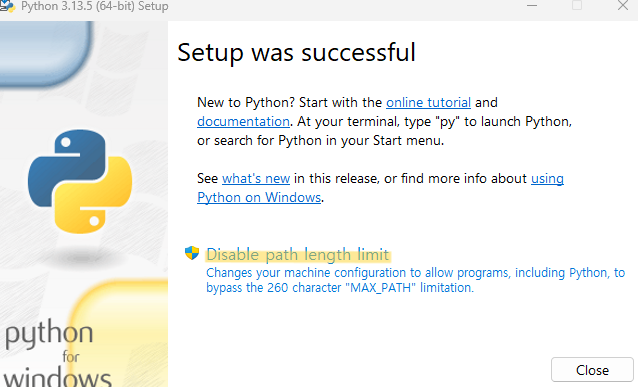 선택 하면 긴 경로 이름도 문제 없이 사용할 수 있어, Python 개발 시 편리합니다.