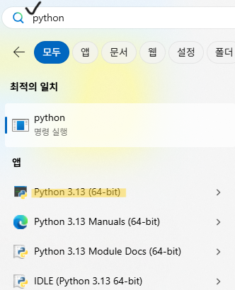 파일의 경로를 찾아서 실행하던지 시작프로그램에 python을 입력하여 python을 실행해주시면 되겠습니다