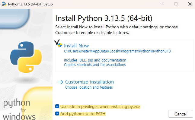 'Use admin privileges when installing py.exe'(py.exe를 관리자 권한으로 설치 합니다, py.exe는 파이썬 런처 프로그램입니다.)