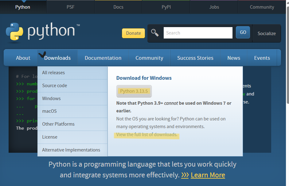 공식 홈페이지에서 dowloads 메뉴에 마우스를 이동시켜 Download for windows의 파이썬 최신 버전을 다운 받는 방법이 있습니다.