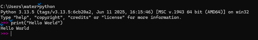 명령프로폼트를 실행하셔서 C:\Users\사용자명>python을 입력하여 정상적으로 파이썬이 작동되는지 확인합니다.