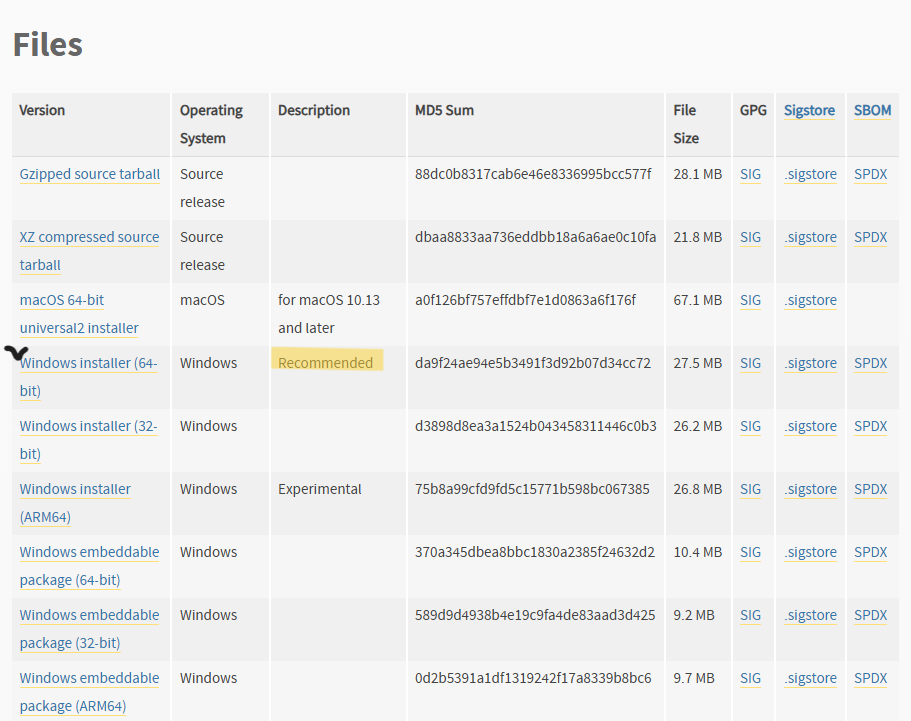 Looking for Python with a different OS? Python for Windows, Linux/Unix, macOS, other에서 본인의 컴퓨터 운영체제에 맞는 항목을 클릭하여 해당 운영체제의 전체 버전을 확인하여 다운 받는 방법이 있습니다.