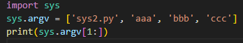 그럼 args = sys.argv[1:] 문법이란 파이썬 문법에서 리스트의 첫 번째 원소 이후 전부라는 뜻이며 파일 이름(sys.argv[0])을 빼고 나머지 값들만 가져옵니다. 그럼 아래와 같은 결과를 가져오게 됩니다.