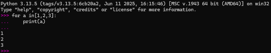 (for)반복하겠다고 선언 후 (a)변수 a를 선언하고 (in) a안에 ([1,2,3])1,2,3이라는 숫자를 앞에서부터 순서대로 저장 후 (print) a를 출력한다라는 명령을 합니다.