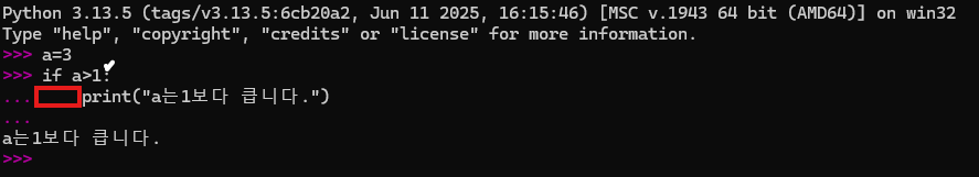 a가 1보다 크기때문에 조건을 만족하여 'a는 1보다 큽니다'를 출력합니다.