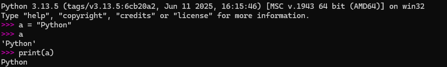 a라는 변수에 "Python"이라는 문자를 가진 값을 저장 후 a를 입력하면 a에 저장된 값을 확인 할 수 있습니다.