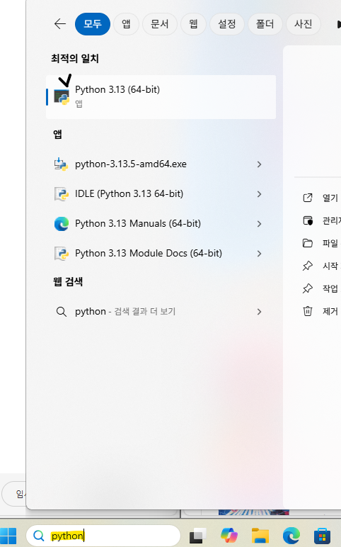 3.xx의 xx는 본인의 컴퓨터에 있는 파이썬의 버전입니다. 저는 3.13이기 때문에 3.13을 실행시킵니다.