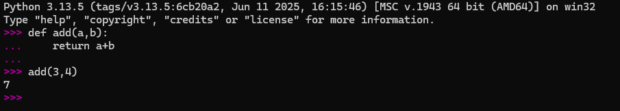 (add(3,4))add함수를 선언하고a에 3의 값을 b에 4의 값을 저장합니다. a,b가 선언되면 값을 결과값으로 반환해주겠다고 한 return으로 a,b의 저장된 값이 반환하여서 최종적으로 결과값 7을 출력합니다.